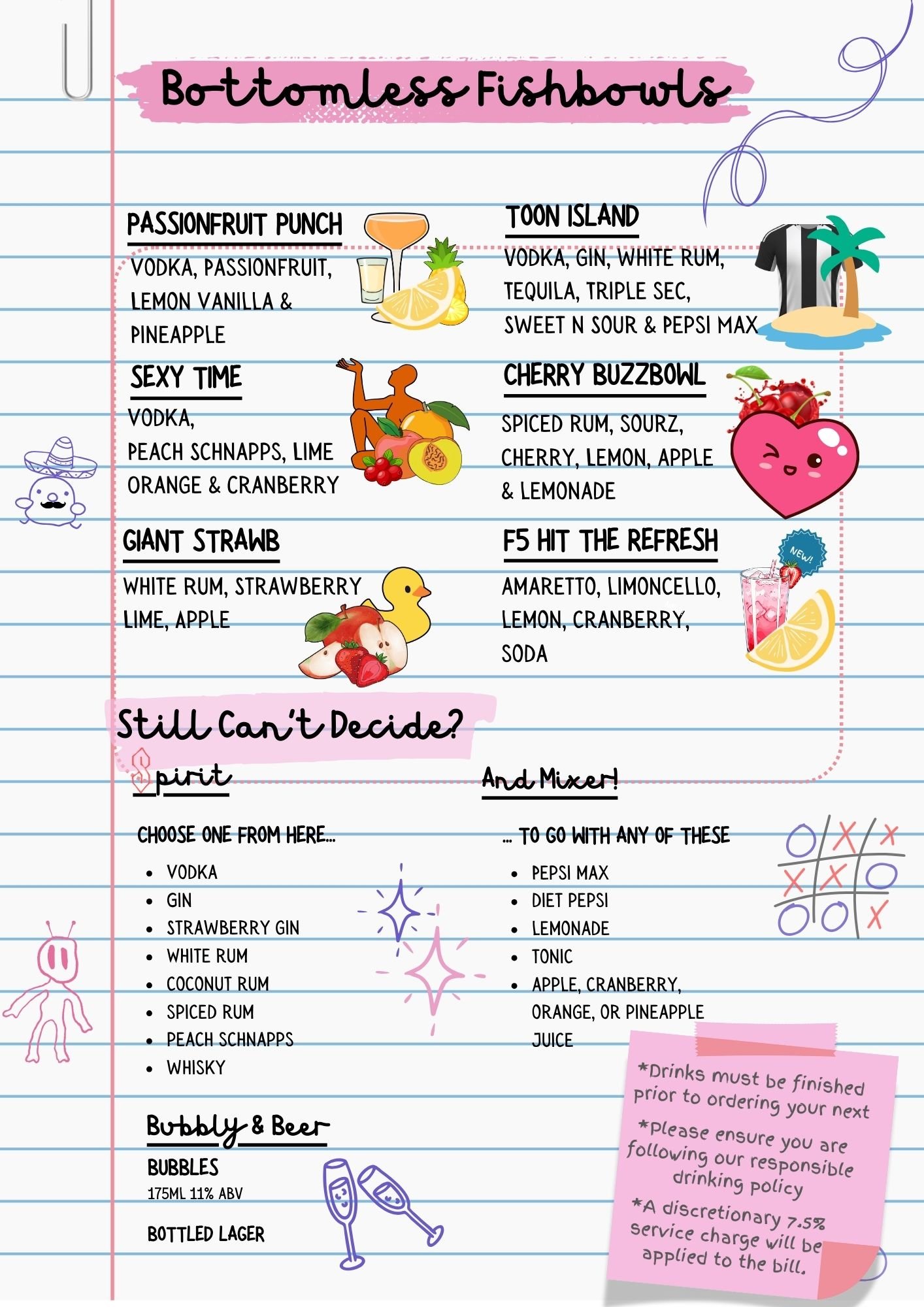 Indulge in a selection of Lager, bubbles, house spirits with mixers, or dive into our delightful cocktail fishbowls!